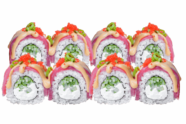 Склад: рис, норі, крем-сир, огірок, тунець, соус спайсі, зелена цибуля, червона ікра масаго