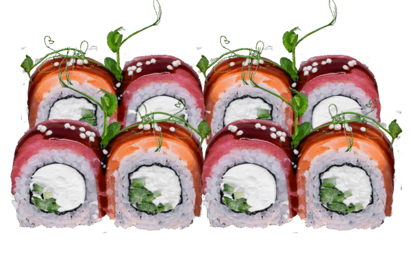 Рол 1 для сету БДСМРол з філе лосося, тунця та рисовими кульками Склад: рис, норі, крем-сир, огірок, філе лосося, філе тунця, соус унагі, рисові кульки, мікрогрін
