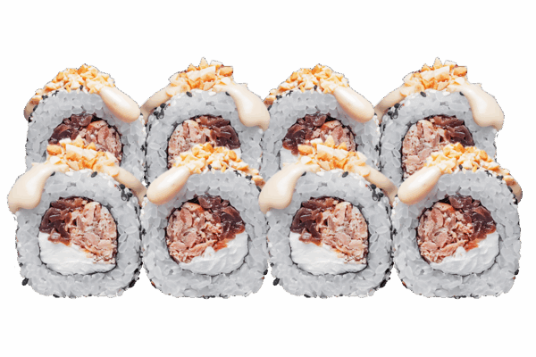 Склад: рис, норі, крем-сир, лосось запечений, гарбуз кампіо, мікс кунжутів, соус фірмовий, арахіс