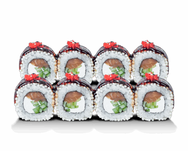 Склад: рис, норі, крем-сир, огірок, маринований лосось, рисові кульки, соус унагі, соус світ чилі, червона ікра масаго, мікс кунжуту