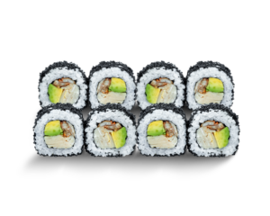 Склад: рис, норі, крем-сир, маринований лосось, авокадо, чорна ікра масаго, соус спайсі, білий кунжут