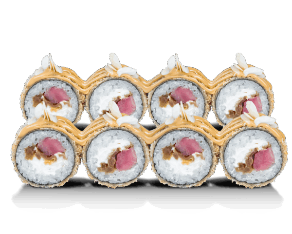 Склад: рис, норі, крем-сир, маринований тунець, гарбуз кампіо, хрустка паніровка, фірмовий, слайси мигдалю