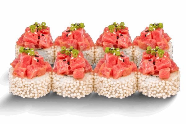 Рол Чилі Тунець для сету ЛісорубРол з гострим тунцем та рисовими кульками Склад: рис, норі, крем сир, огірок, рисові кульки, спайсі чилі тунець, перо зеленої цибулі, мікс кунжуту