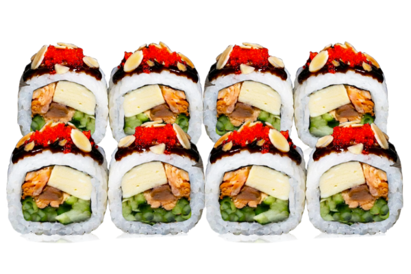 Рол із запеченим лососем та омлетом до сету МольфарЗапечений лосось, омлет масаго, слайси мигдалю Склад: рис, норі, запечений лосось, огірок, омлет томаго, червона ікра масаго, соус унагі, слайси мигдалю