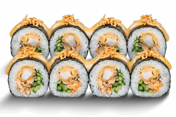 Рол Креветка та лосось для сету ЛісорубРол з креветкою в темпурі та запеченим лососем Склад: рис, норі, креветка в темпурі, японський омлет, запечений лосось, огірок, фірмовий соус, криспі краб