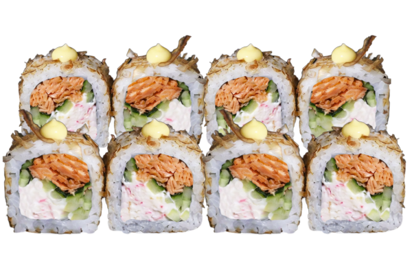 Рол з вершковим крабом до сету МольфарВершковий краб, запечений лосось та стружка тунця Склад: рис, норі, вершковий краб, огірок, запечений лосось, стружка тунця, японський майонез