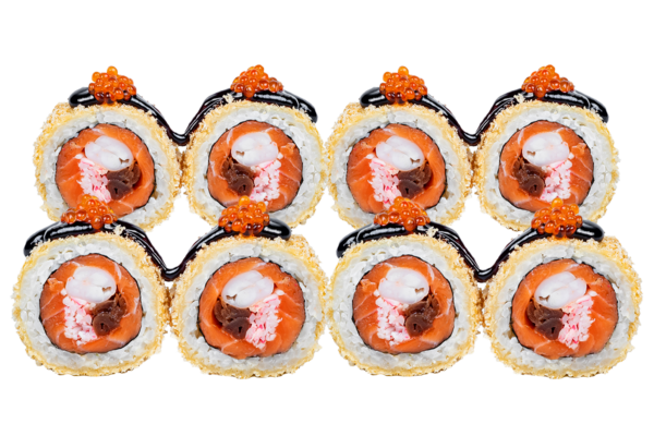 Склад: рис, норі, філе лосося, варена креветка, вершковий краб, гарбуз кампіо, хрустка паніровка, соус унагі, червона ікра
