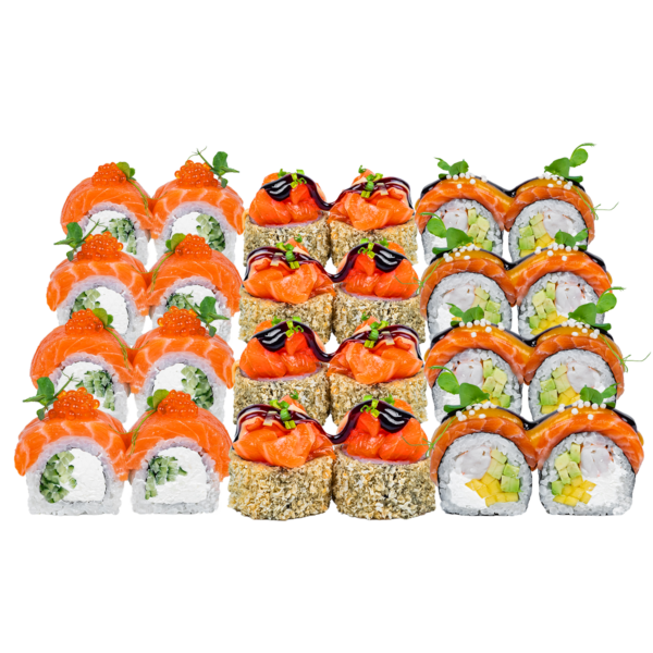Склад: рис, норі, крем сир, огірок, філе лосося, червона ікра, мікрогрін