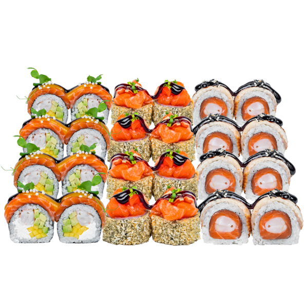 Склад: рис, норі, філе лосося, варена креветка, вугор, соус унагі, мікс кунжуту